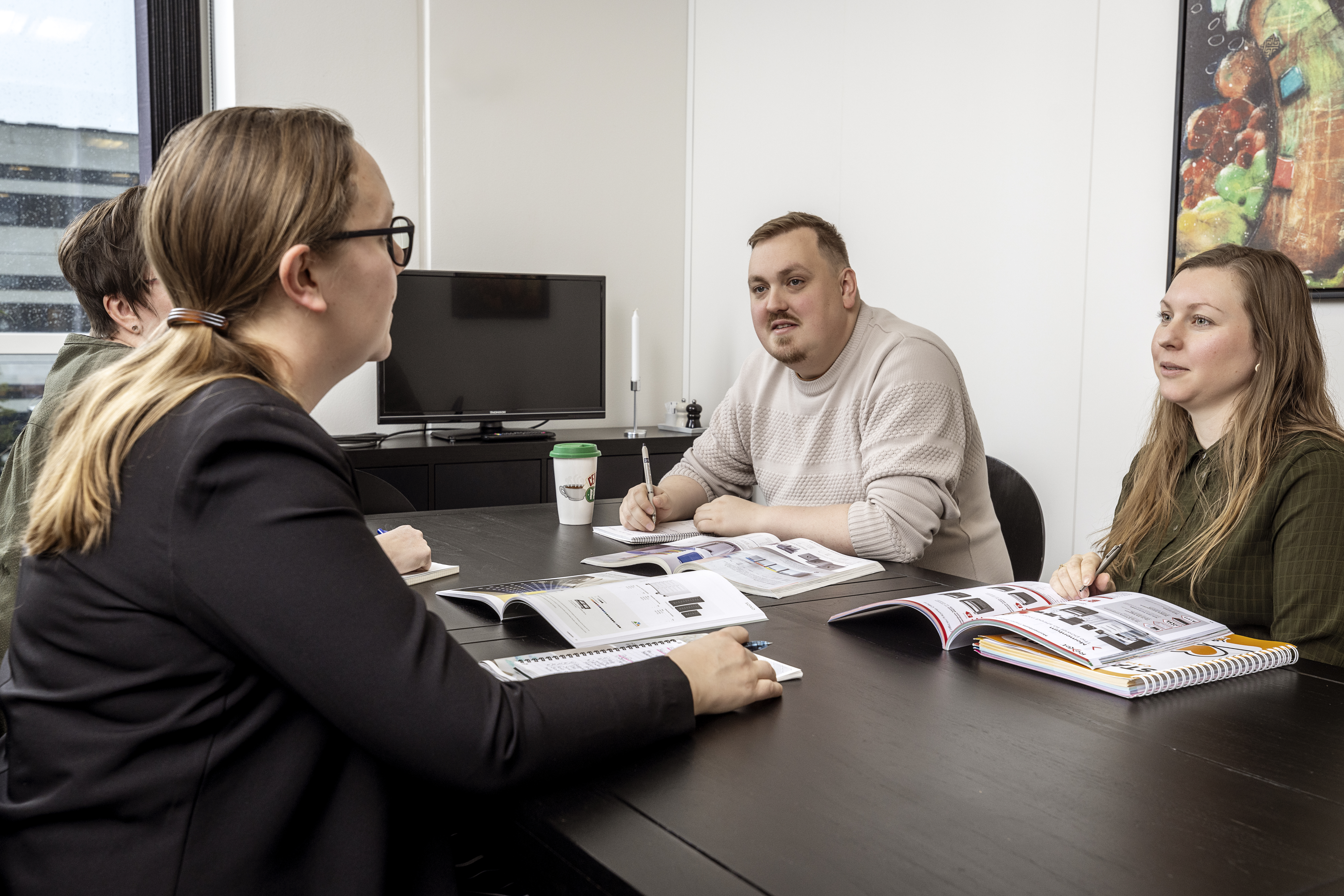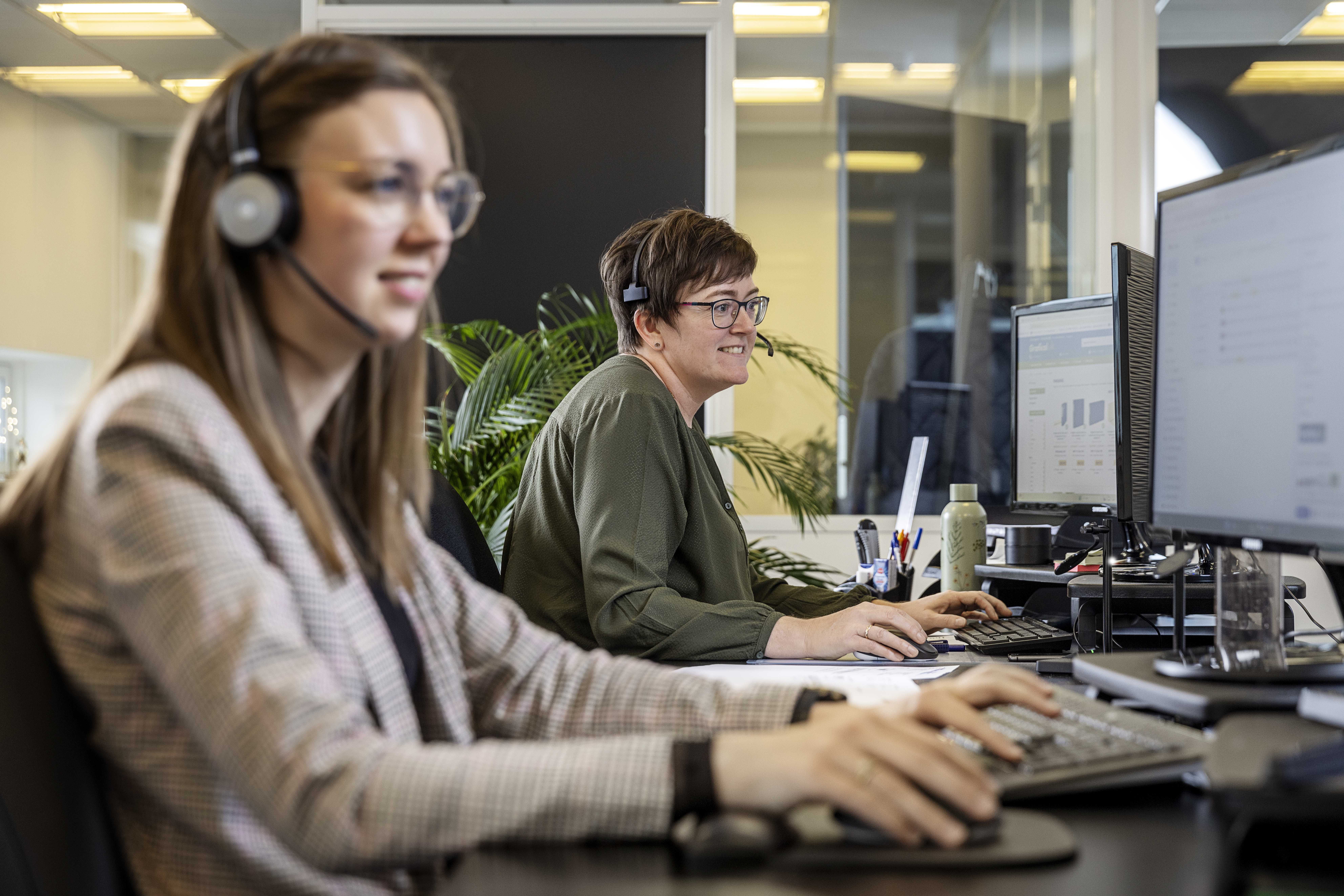 Kundeservicemedarbejdere med logo i baggrund i trykkvalitet (6 MB)