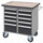 Korrekt og overskueligt opbevaring på dit lager! Værkstedsvogn med lakereret træfiner bordplade og nedfræset stålkant rundt om hele arbejdsoverfladen. Vognen har af 10 skuffer som alle leveres med gummiMålee i bund og central cylinderlås. Vognen leveres med to faste og to drejelige Ø150mm hjul heraf 2 med brems. Kabinet er gråt RAL7004, dør og skuf
